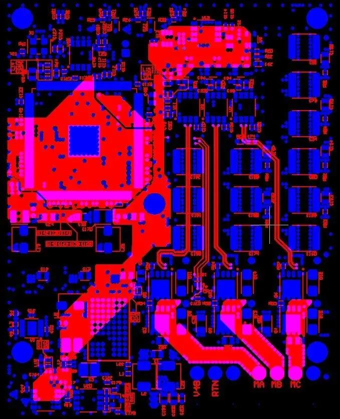 At lower right of the adjacent PCB layout are circuits MA, MB, and MC — the three current carrying circuits for the motor windings. And these were the ones whose routing we had to address carefully to keep their noise off the other feedback circuits on the board.