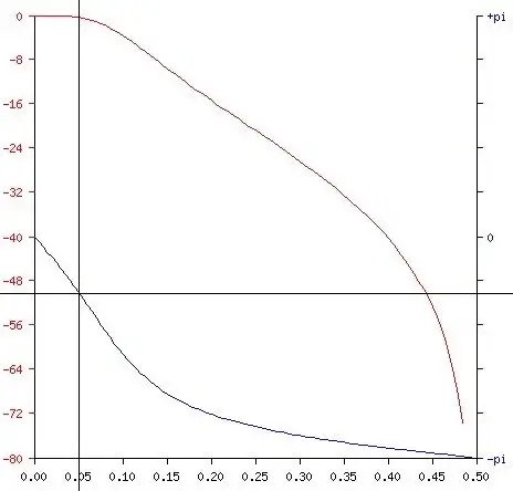 As shown below by the upper line (amplitude), by the time we were at the -3dB point of the filter, we were at roughly 1/4 pi (45 degrees) phase delay as we would expect.